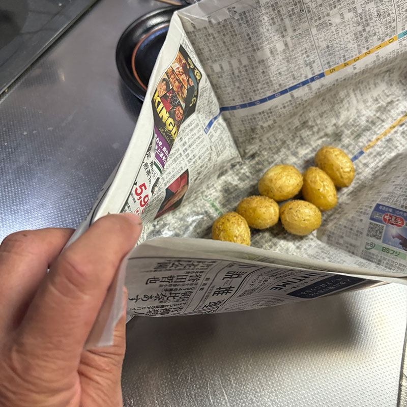 新聞紙にとって塩胡椒してゆすると油は新聞紙に吸われ