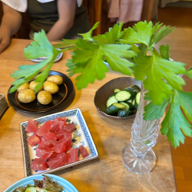 一輪挿しには畑から摘んできたイタリアンパセリ。好きなものに散らす。
