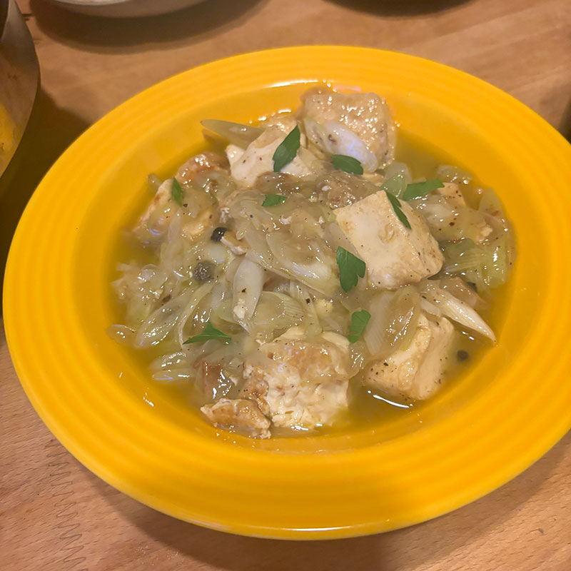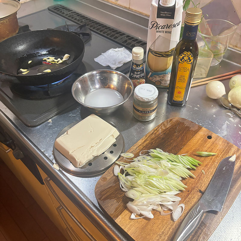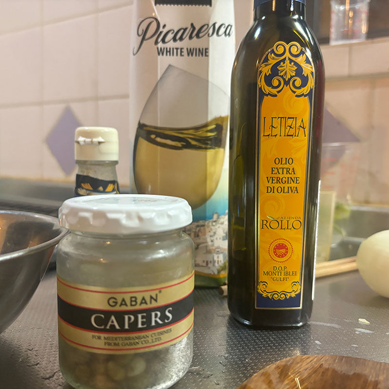 友だちにもらった美味しいオリーブオイル、アンチョビ、ケイパー、黒粒胡椒、ワイン、長ネギ、ゲランドの塩。