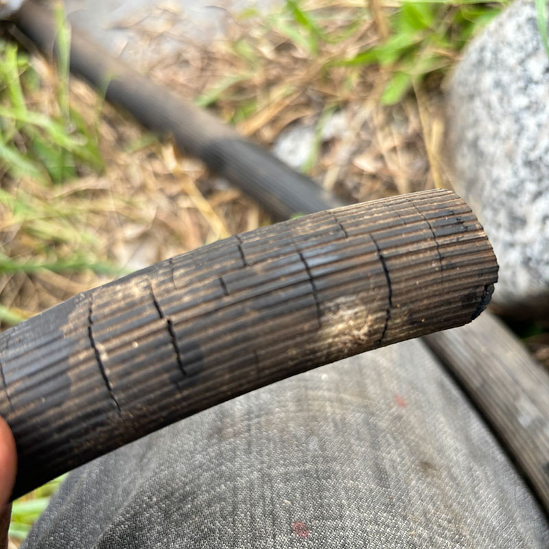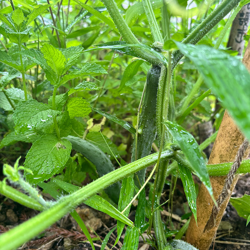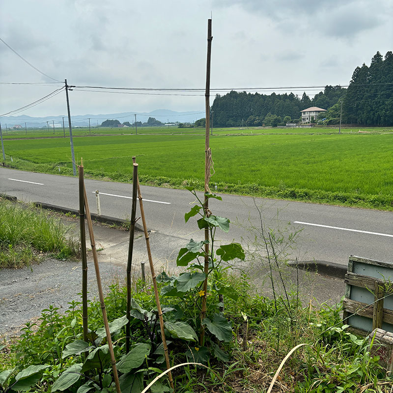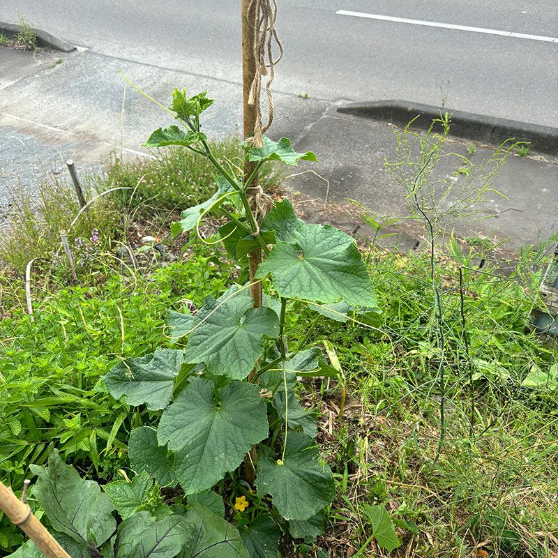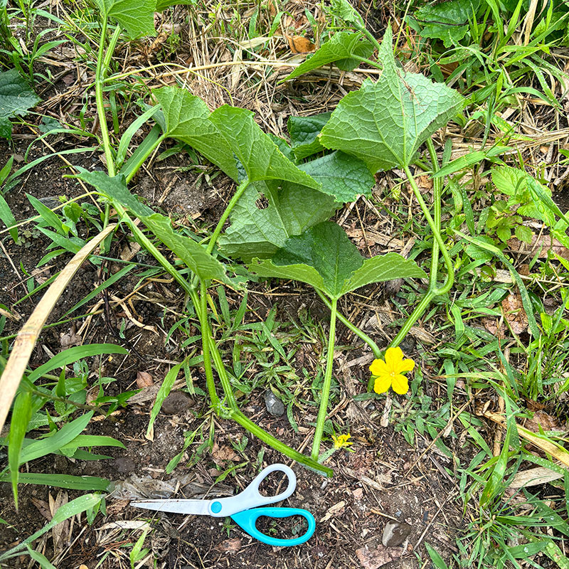このきゅうりは太い竹を一本刺してそれで支えて手が届かないところまで伸びたら全体を下に降ろす、というネットを使わない方法で育ててみる。YouTubeで見て面白そうだったので。