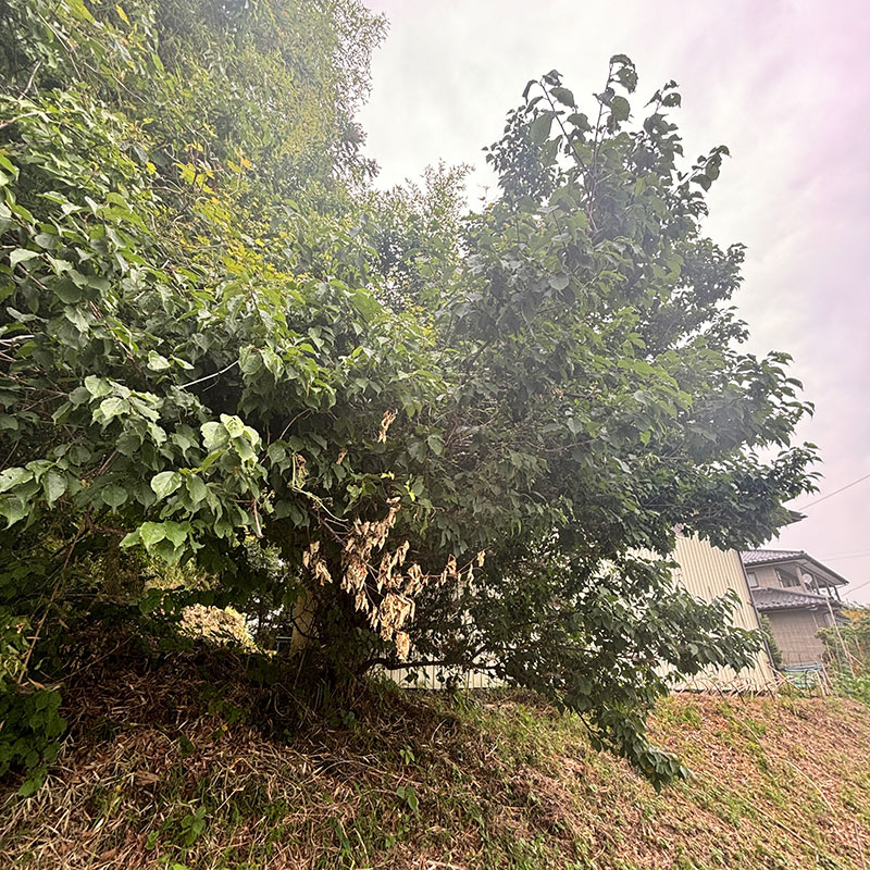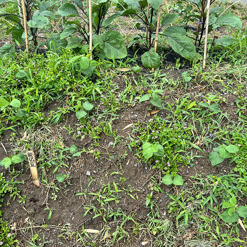 土手に種まきした秘伝豆。葉が大きくなって他の草と見分けがつくようになってきた。この土手にはヒメイワダレソウが広がりつつあるのでそれと秘伝豆は抜かずに他の草だけ抜いていくのが大変。