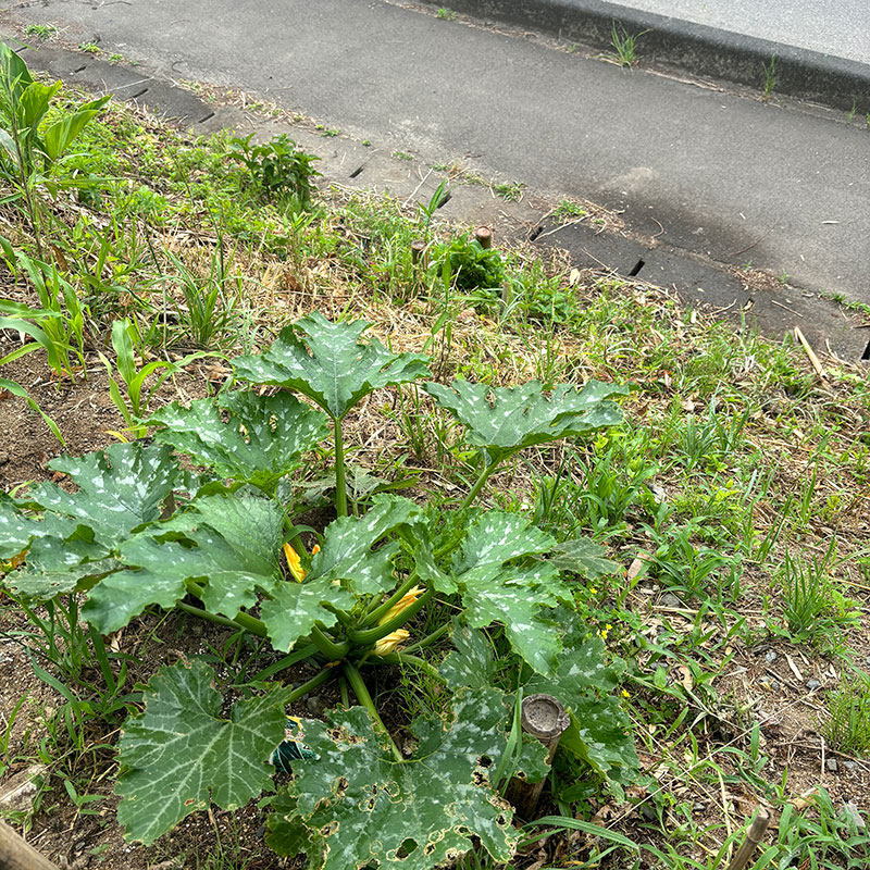 ズッキーニたくさん花が着き始めた。この土手を降りながら実をつけてもらう。去年はいくつも収穫しながら土手の下まで届いた