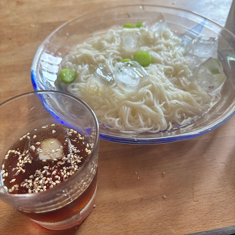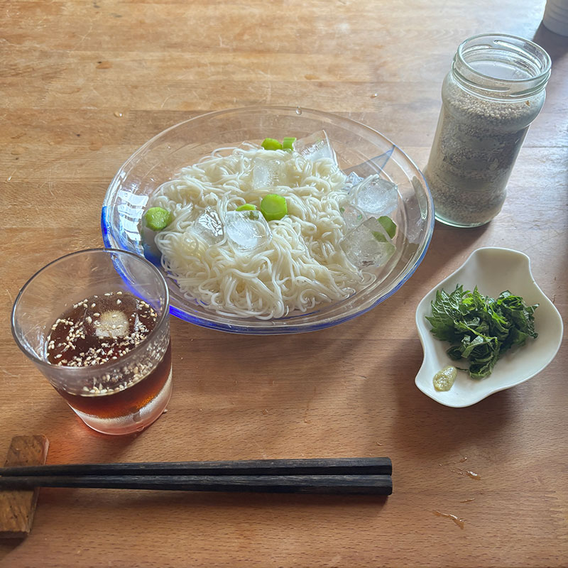 畑からきゅうりと大葉を摘んで胡麻やわさびと共に薬味に。ただの素麺でも丁寧にめんつゆ作って丁寧に麺を茹でたら美味しい美味しい。