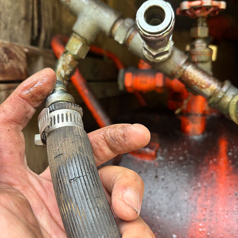 原因は何年も使ってる耐圧ホースの劣化だった。所々に小さな亀裂。