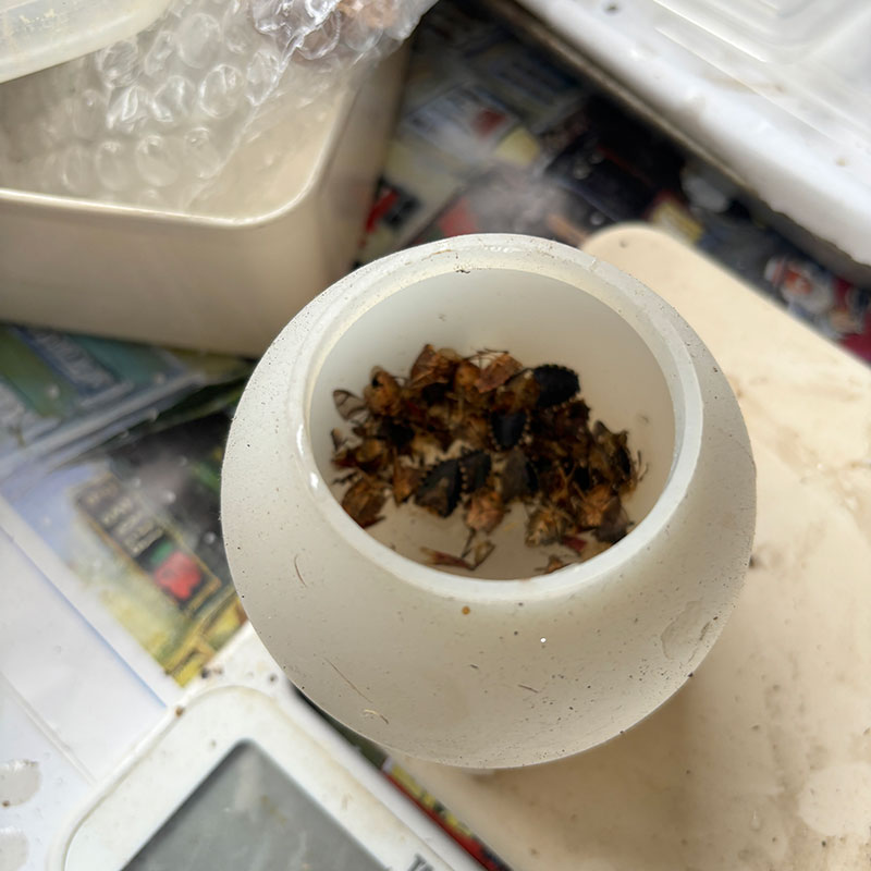 虫嫌いの方、ごめんなさい。透明樹脂のシリコン型の中が暖かかったのかカメムシがいっぱい入っていた。しかもツルツルして出られなかったようで中でみんな死んでる。いつも防寒着のポケットとか冬用の帽子とから思いがけないところで越冬されて困ってたのにラッキー。