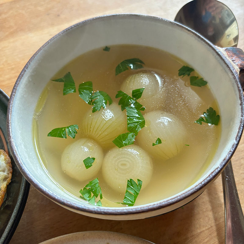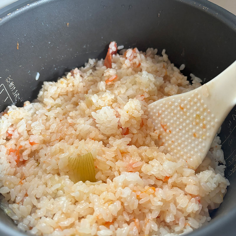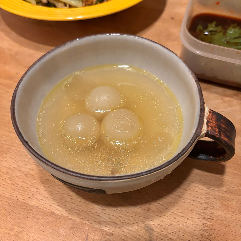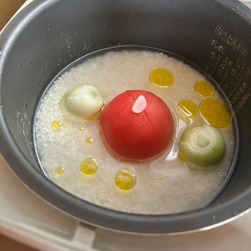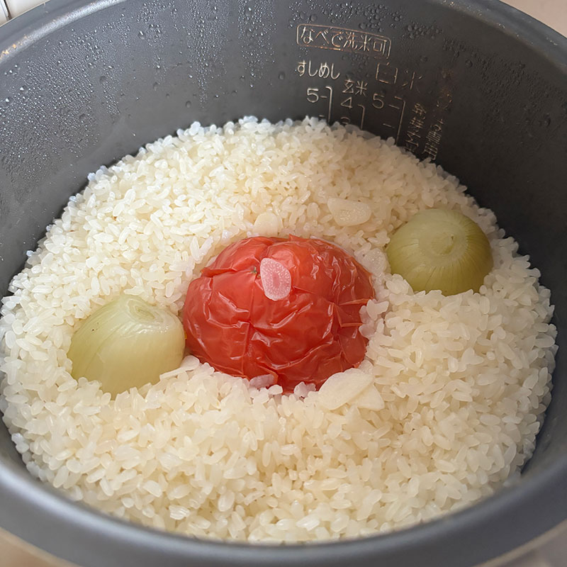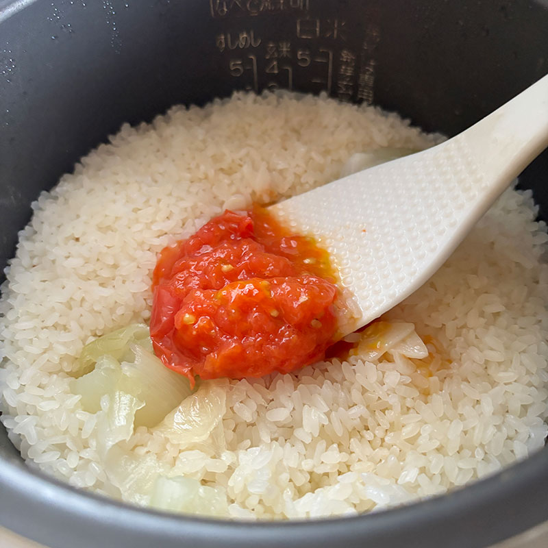 柔らかくなった新玉ねぎとトマトを潰して混ぜる。