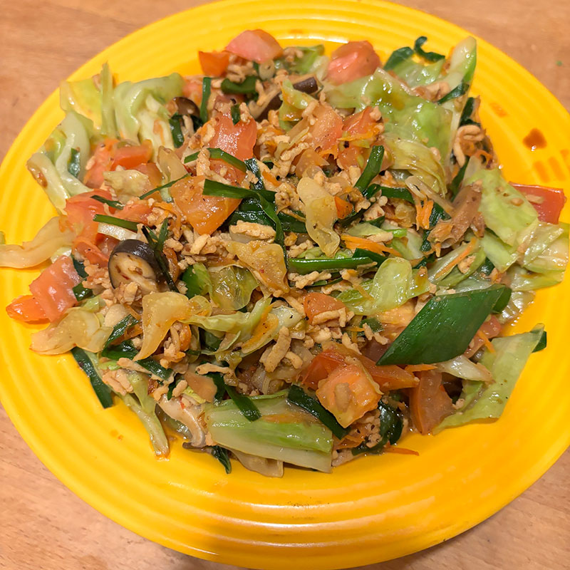 冷蔵庫の片付けを兼ねて炒め物。キャベツ、トマト、冷凍椎茸、にんじん。にんにくと畑のニラ、大きくなりすぎてるイタリアンパセリをどっさり。豆板醤、豆豉醬、四川麻辣醤、醤油で味付け。