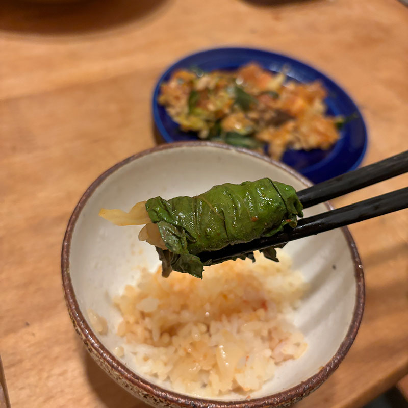 大葉。コチュジャンとポン酢混ぜたところに漬けておいてご飯巻いて食べると最高