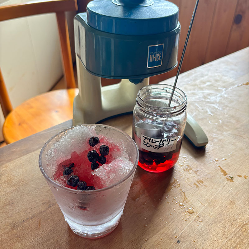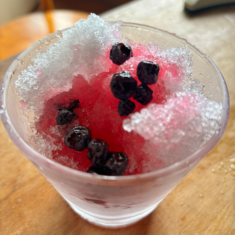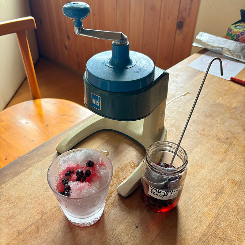 かき氷。自家製のブルーベリーのシロップで。だからこの色合成着色料じゃないよ。