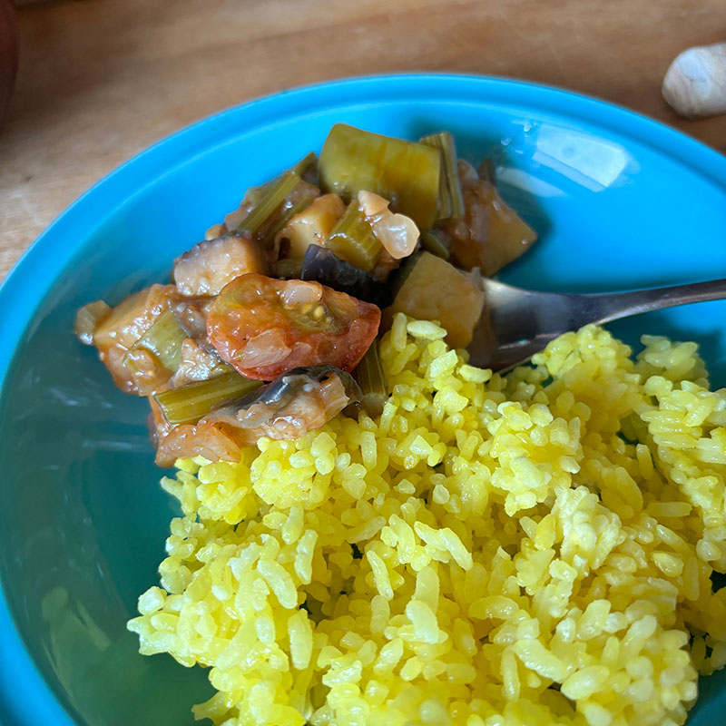 昨日、畑の夏野菜で仕込んで冷蔵庫で冷やしておいたカポナータとターメリックライスの昼飯。暑くて食欲ないけどカポナータの酸味でなんとか食べられる。冷たくて美味しいし。