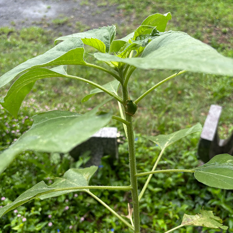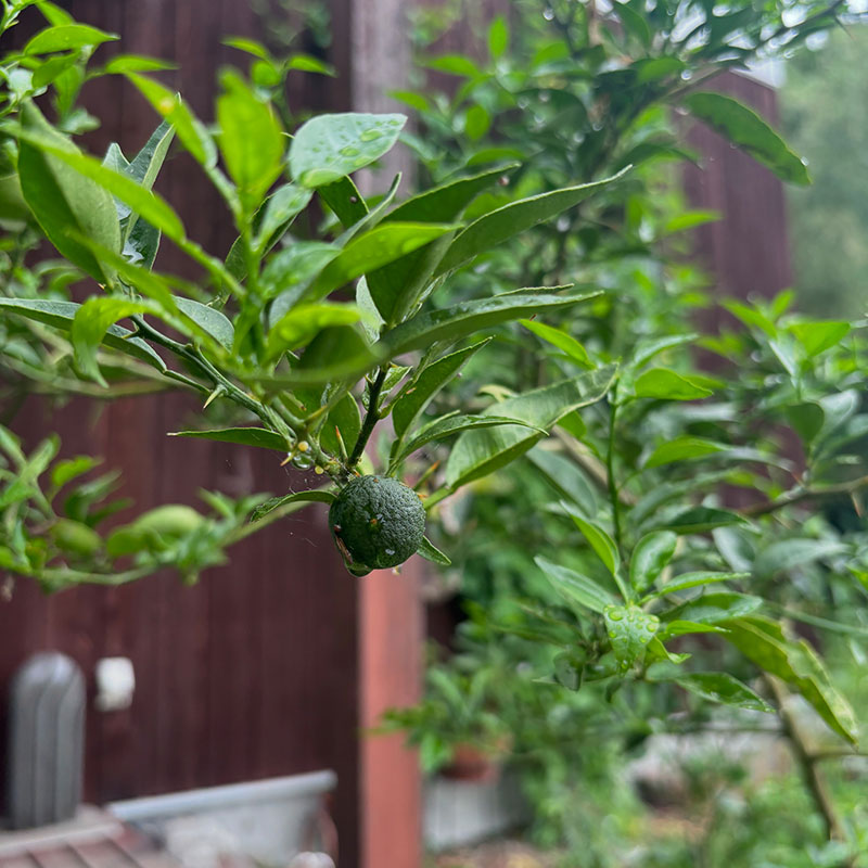 食べた後の種から育てた徳島のすだち。4年目の今年初めて実をひとつだけつけた。少しずつ大きくなってる!秋に焼いた秋刀魚に果汁かけられるかなw