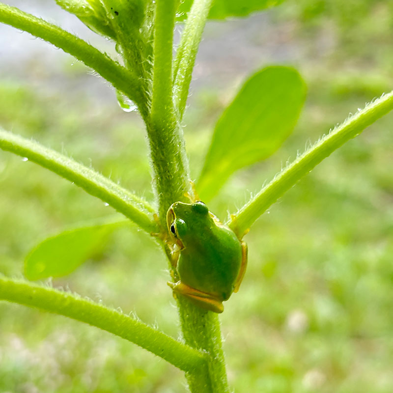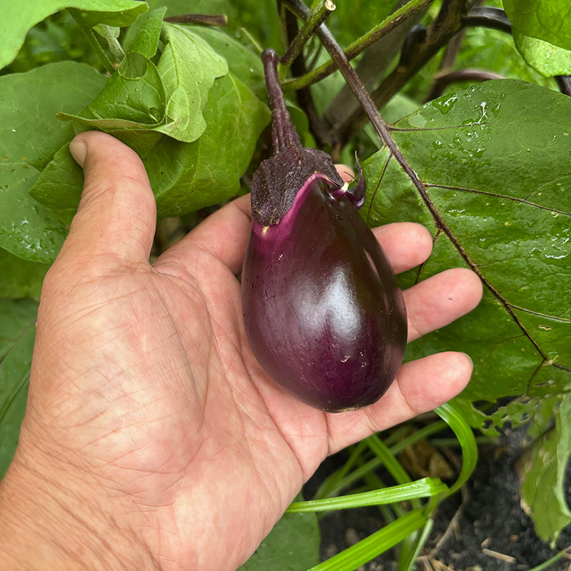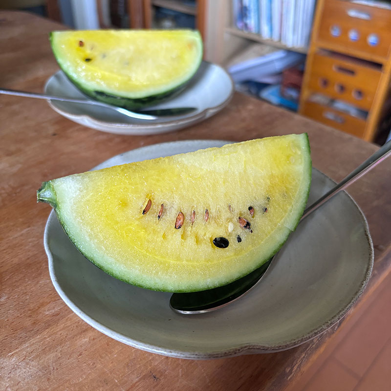 畑の小玉スイカ。今年も甘いスイカが採れた。他の野菜より特別感ある、だけど今年は間違って黄色のスイカの苗を買ってしまった。