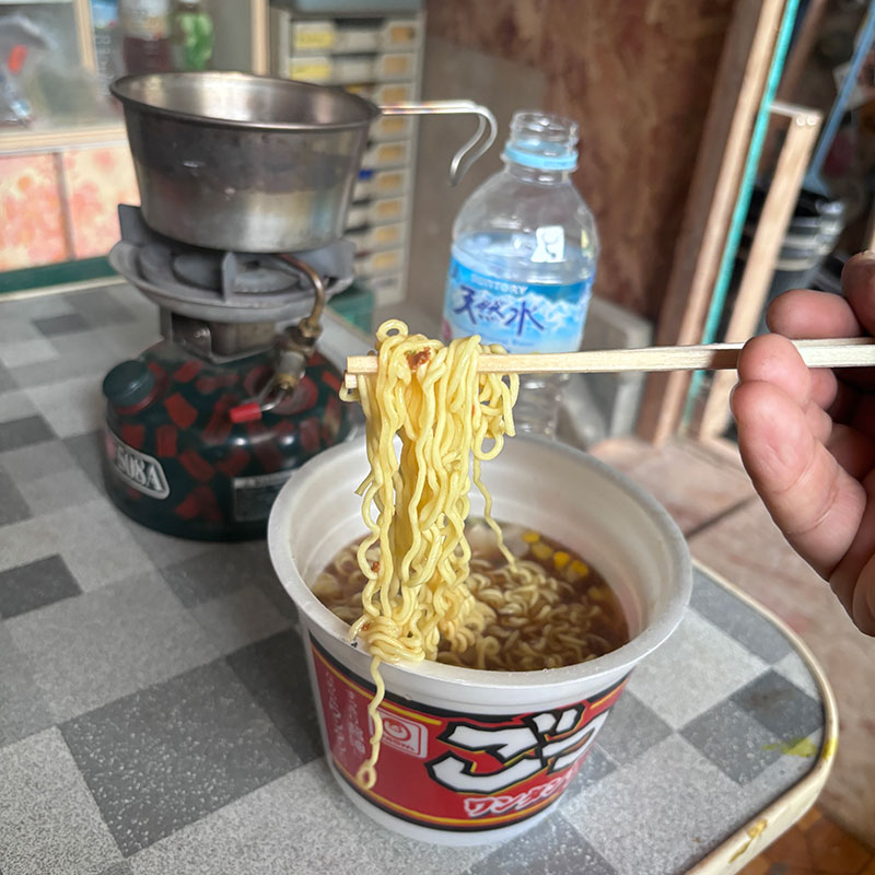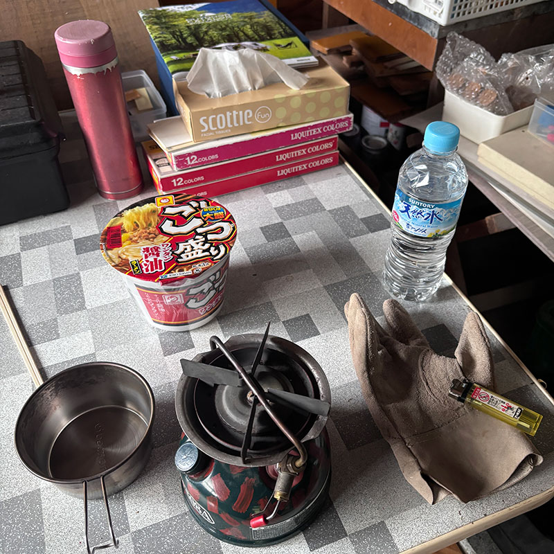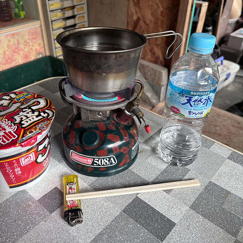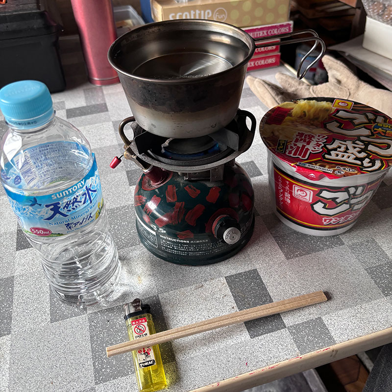 雨宿りとワンバーナーのメンテを兼ねて朝ラー。