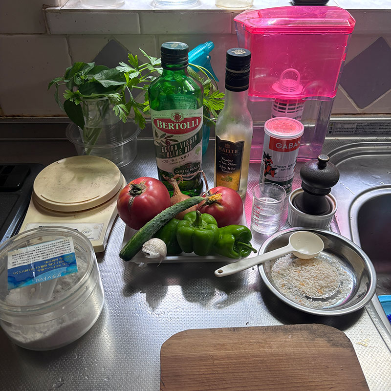 うちの畑はどうしてもトマトがならないので完熟トマトを地元の産直広場あぐりっとで買ってきた。いただいた玉ねぎと畑から、青ピーマン、きゅうり。パプリカは今回はピーマンで代用。にんにく。