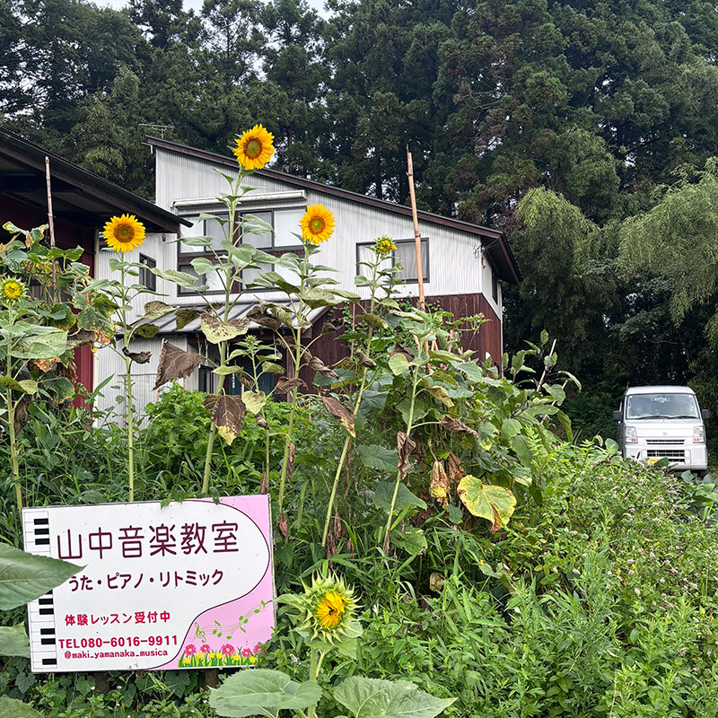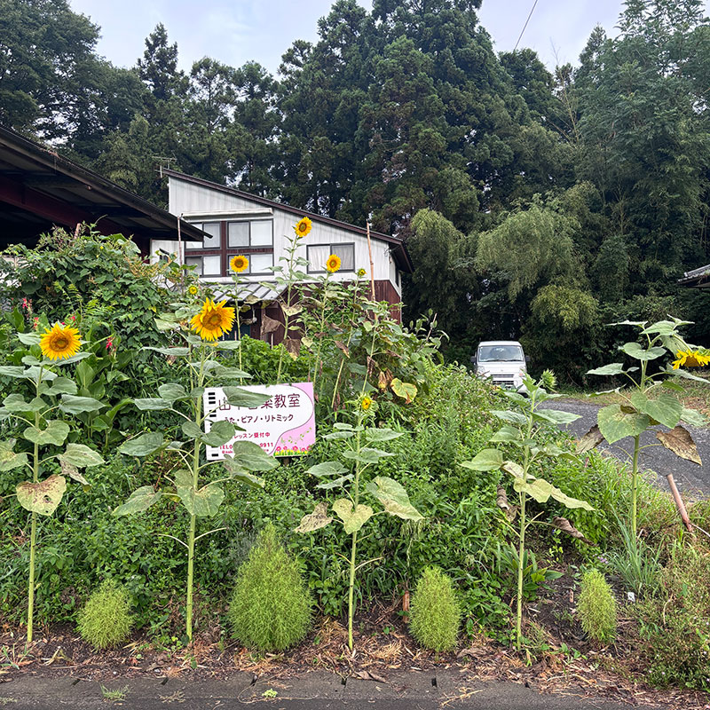 カミさんの音楽教室の看板の上に黄色い花を並べようと思って植えたひまわりは背高くはるか上で花を咲かせた。