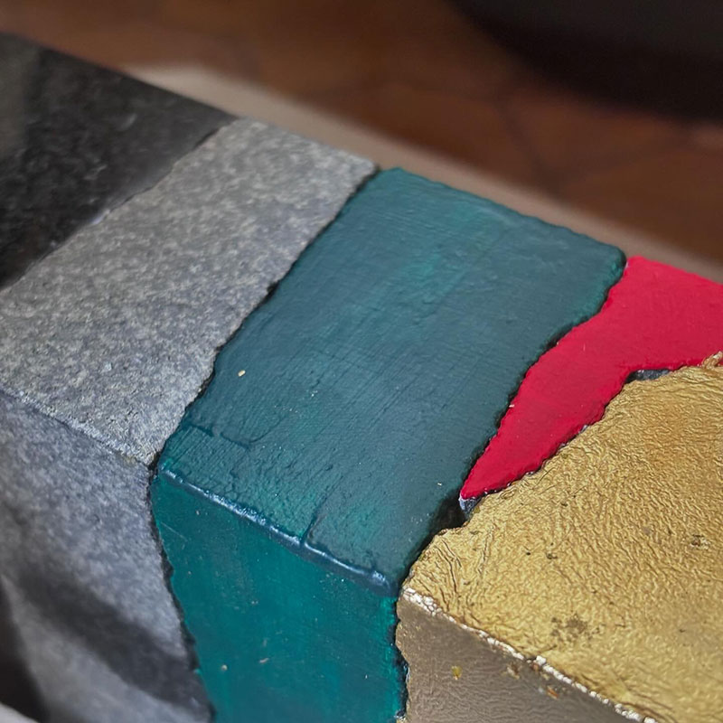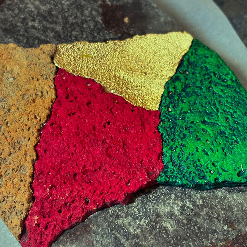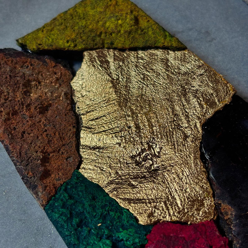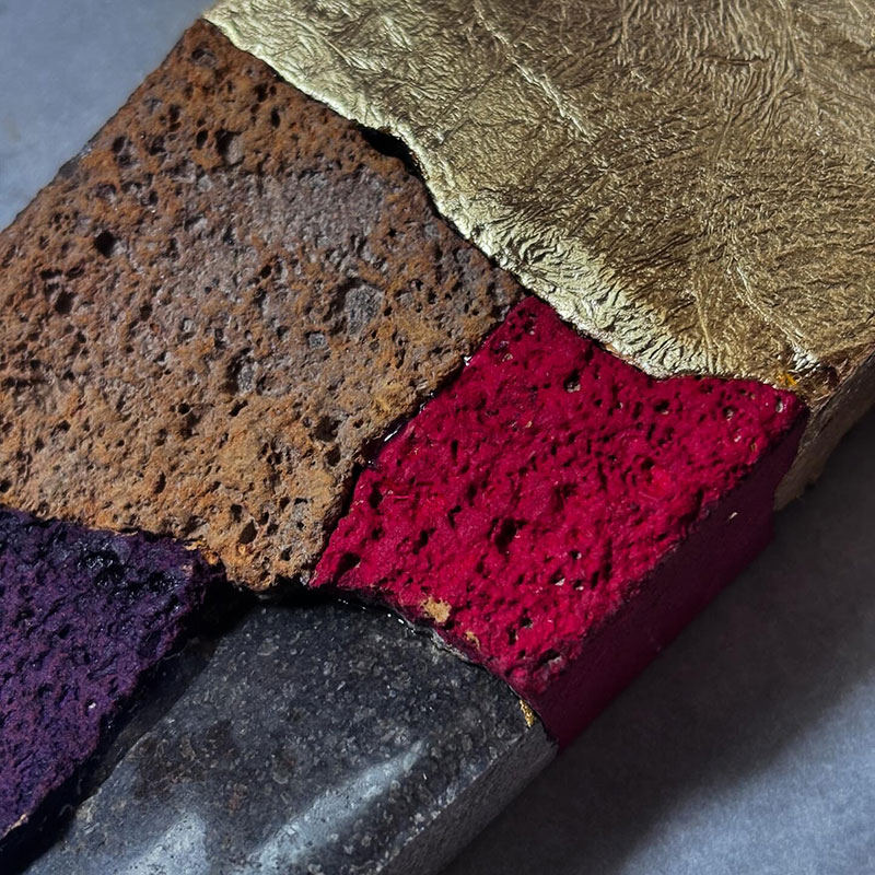 石を割って、削ったり磨いたり色を塗ったり、金色の箔を貼ったりして再構成する”彩分割石”のシリーズ。