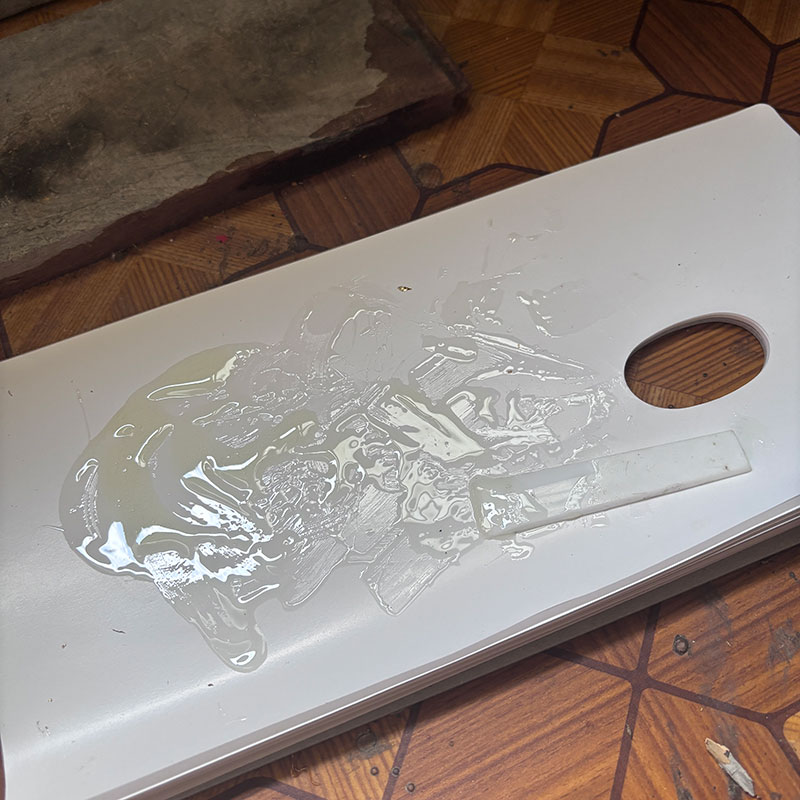 そしてやっと再び元のようにする接着の工程まできた。割った後の石ひとつひとつに手を加えるから時間と手間がかかる。箔の接着も乾燥まで時間を食うし。この後の木で額縁作るのも何気に大変。夏が終わっちゃう!