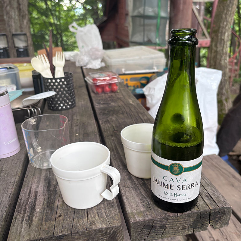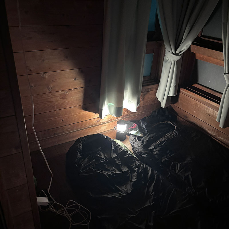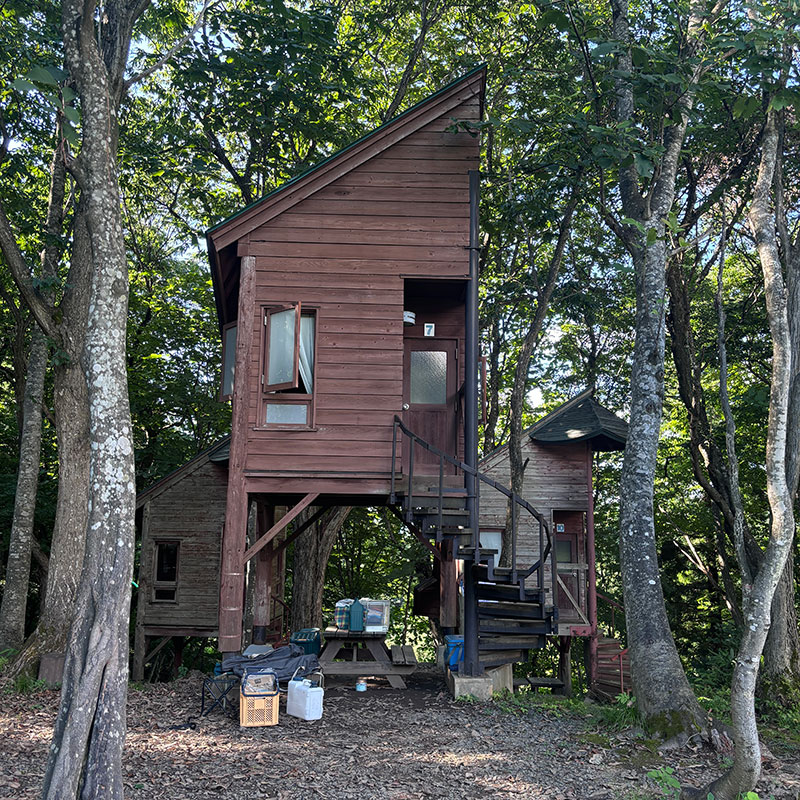 以前は立って作業できる広い居間と寝室を持つツールームテントでキャンプしていたけど今回はこのキャンプ場ではツリーハウスと呼ばれる高床式の広さ約2畳半の建物を借りた。一階は雨と太陽をしのいで料理したり備え付けのテーブルで食事ができる。