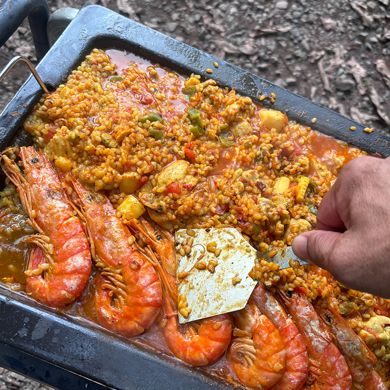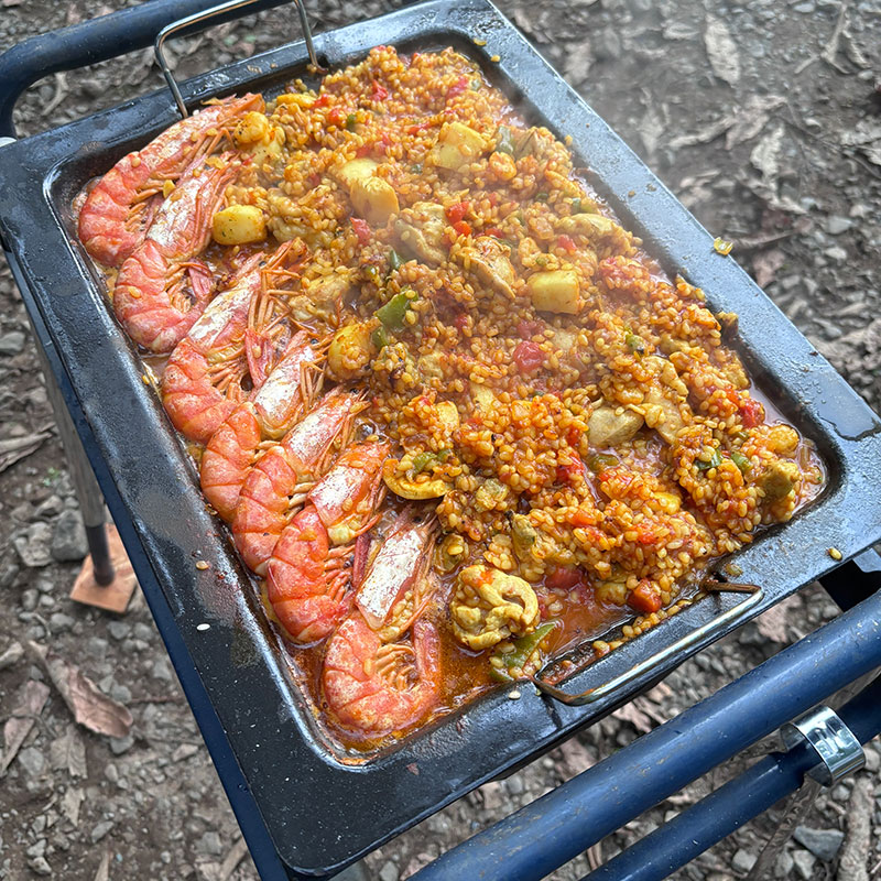 炭が熾たら海鮮たっぷりの鉄板パエリア作った。