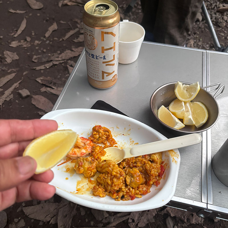 美味しく炊けたパエリアにはレモンをかけると美味しさ倍増。でも米2合、鶏肉や海鮮たっぷりでどう考えても作りすぎた。10人前以上あっただろう・苦笑