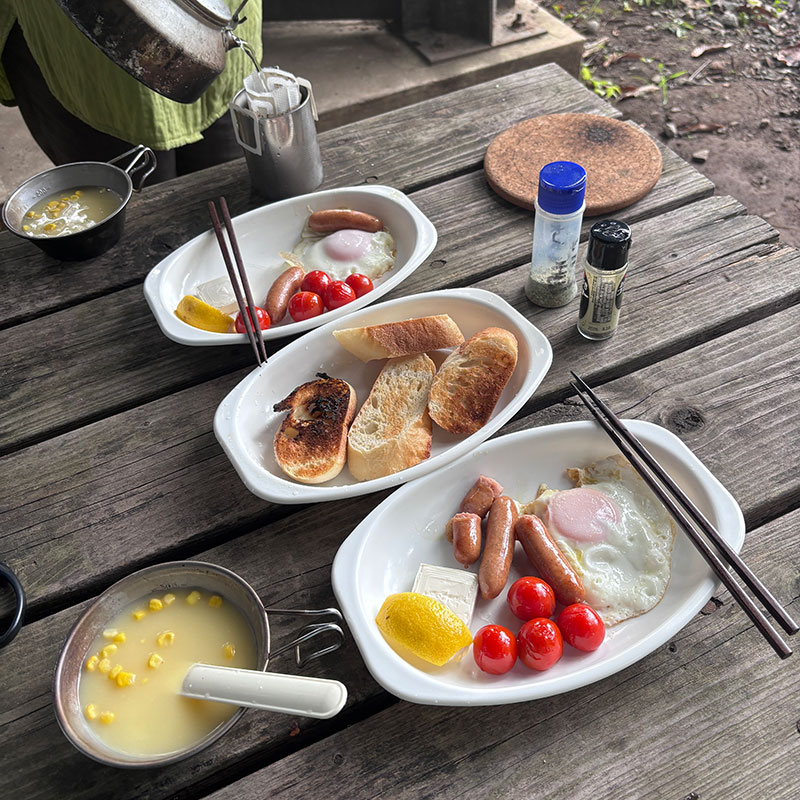 昨日と同じ朝ごはん作って片付け&撤収。雨に降られなくて良かった。それにツリーハウスの区画は駐車は禁止だけど荷物の運搬の際は建物に横付けOKなので楽だ。今回はテント無しだし荷物少なめだからカミさんの車の後部座席がフルフラットになるのでシート敷いて道具積んだ。