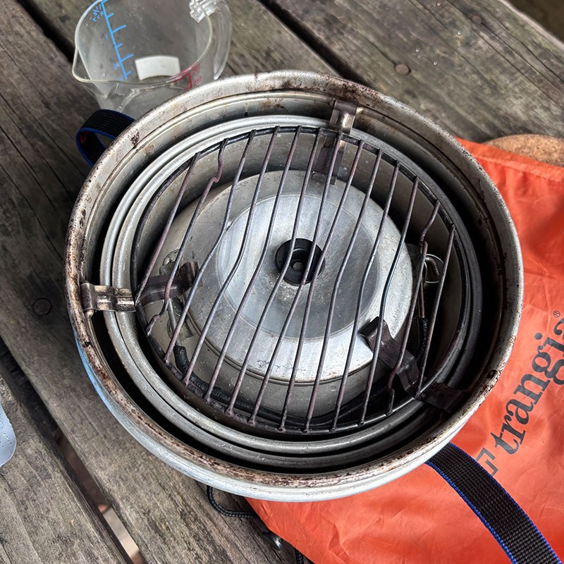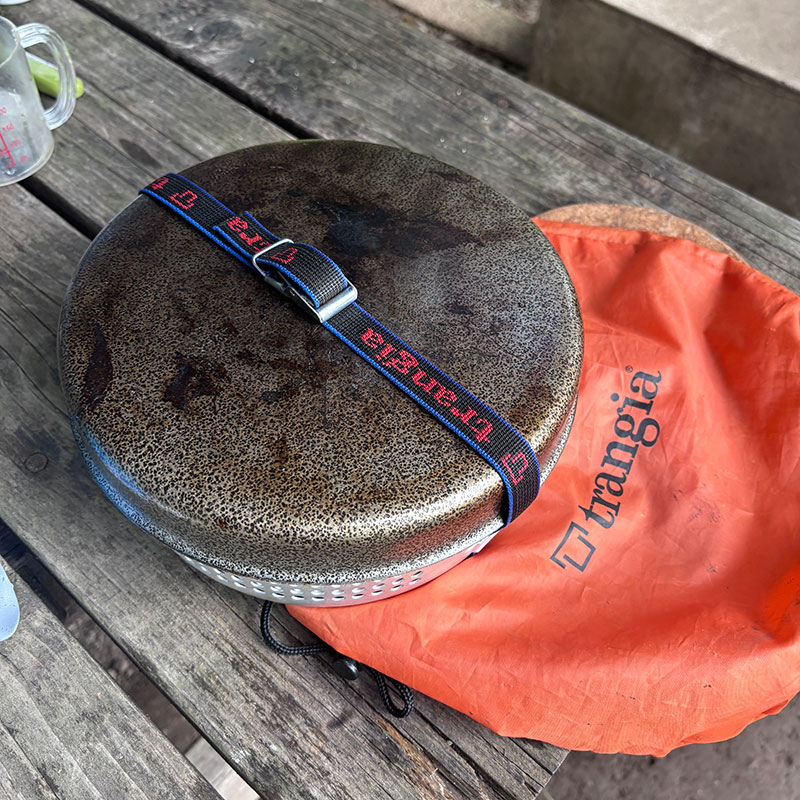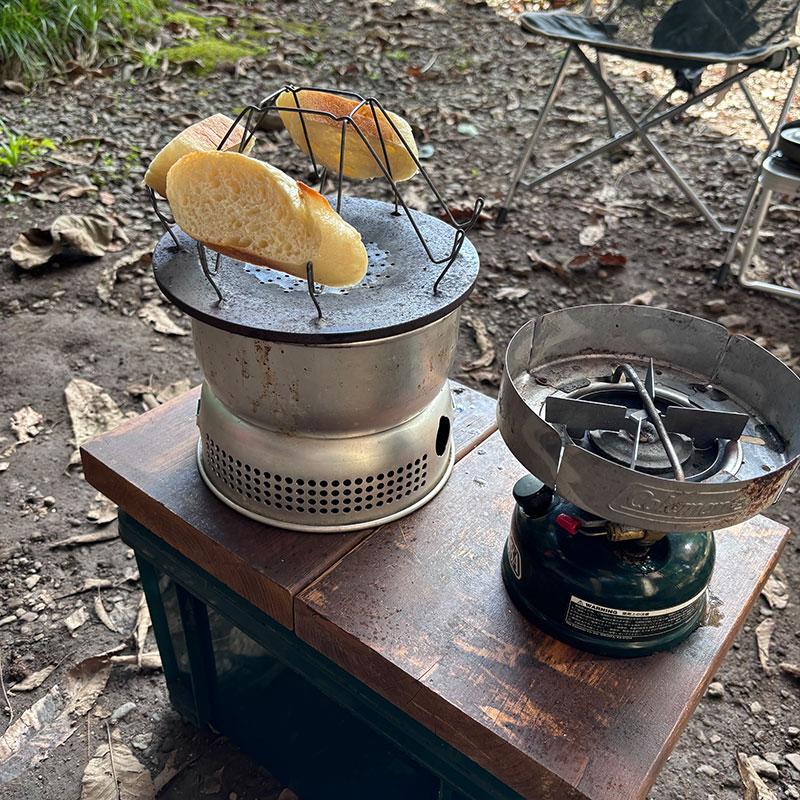 トランギアのアルコールバーナーを使うストームクッカーとコールマンのホワイトガソリンを燃料とするワンバーナーを使っている。スタンドもついたツーバーナーだといつものように料理できて楽だろうけど日常の台所感満載なのが嫌だ。ストームクッカーとワンバーナーは燃料が違うので2種類常に携行しないといけないのが難点だけど。機動性もいいしちょっと使いにも便利。ストームクッカーは風が吹けば吹くほど燃えやすくなるようデザインされているしアルコールバーナーなので燃える時の音がしない。夜テントの中で静かに鍋をつつくなんて使い方もできる。ワンバーナーはゴーっという音があまり好きじゃ無いけど一気にお湯を沸かす、とか強い火力がいる時に便利。そしてこのふたつをうまく使い分けて併用すると料理もすごく上手くいく。この組み合わせ、すごく気に入ってるし便利だし使い勝手が良すぎ!!