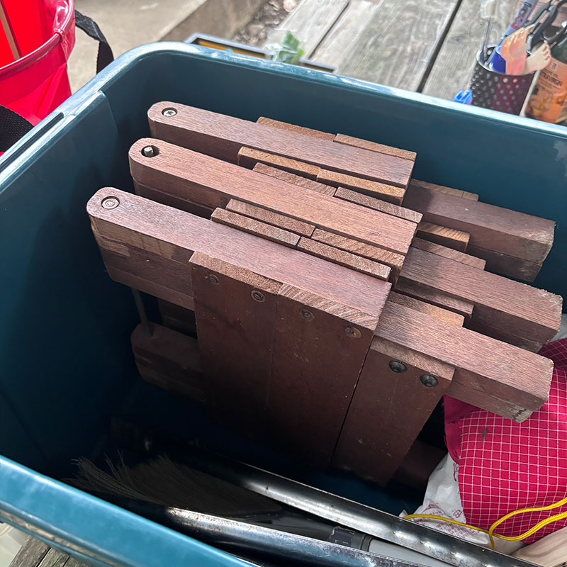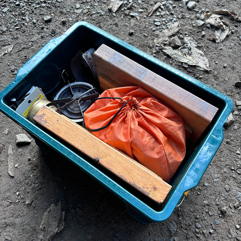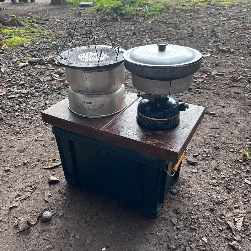 ぴったりハマるようにして簡易調理台兼収納を作った。いつもはこの上にふたつの調理器具を乗せて料理している。木なので熱いもの置いても大丈夫。更にこの天板の木も収納ケースに入るサイズに設計した。