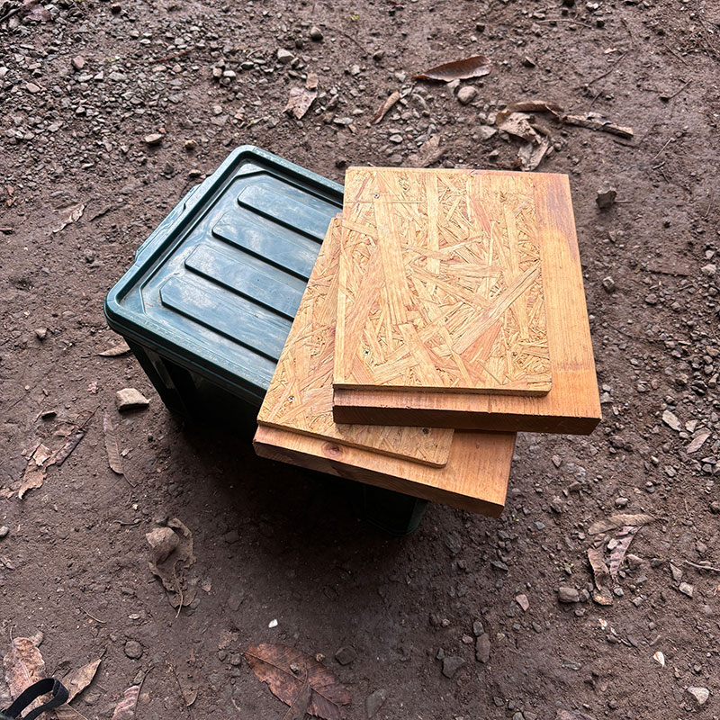 更にプラスチックの収納ケースのフタに厚めの木材の天板が