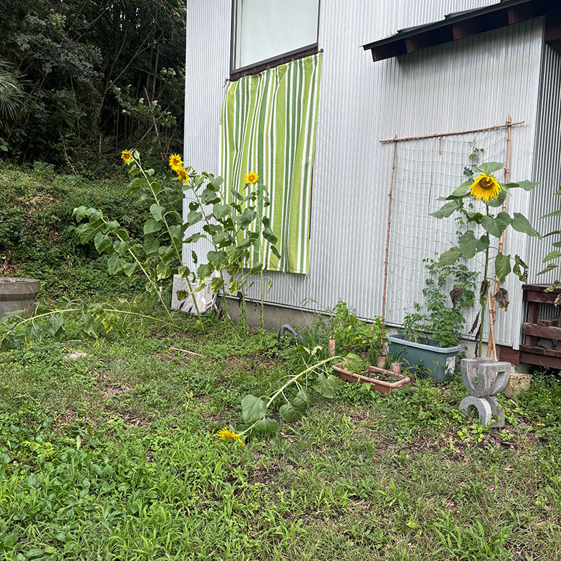 台風で倒れたひまわりを竹の支柱で支えたり補強した後、
