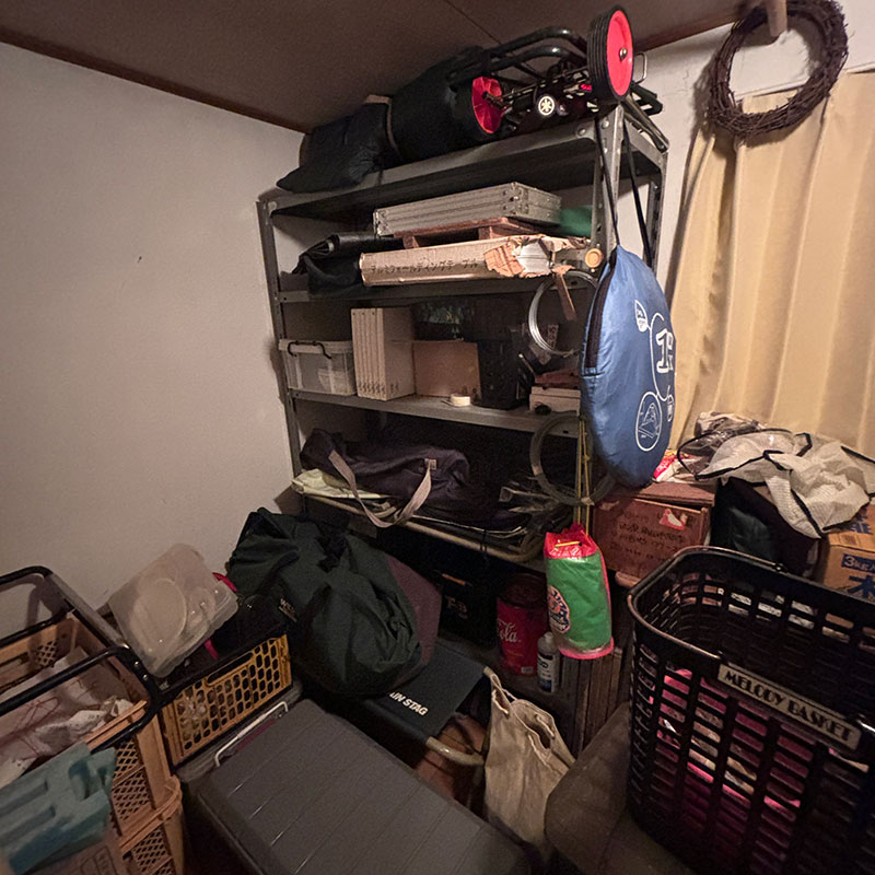 キャンプ道具用の棚に荷物を全部しまい終えたところで