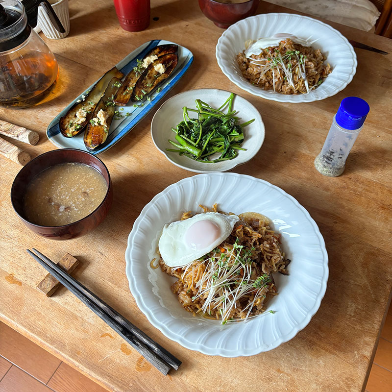 そば飯にもすだちすごく合った。美味しさ倍増。畑でまだまだ大きな茄子が取れるので焼き茄子。大葉の穂紫蘇振って。焼き茄子が吐き戻した油がたっぷりだったので @happyhappyakiaki さんが育てた空芯菜を炒めた。美味しくて幸せな昼飯でした。