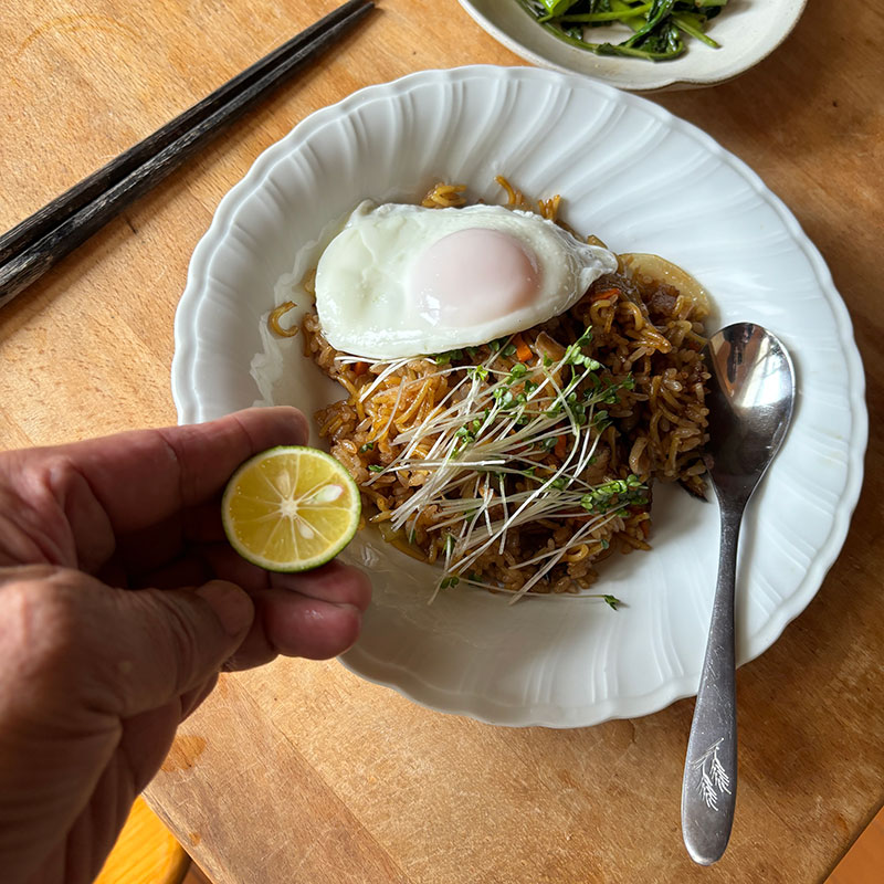 焼きそばは3人前のばかり売っててカミさんと食べた後いつも1食残る。それを昼飯にカミさんがご飯と一緒に炒めてくれた。そば飯初めて。半熟の目玉焼きとブロッコリースプラウトをトッピング。そば飯ってこんなに美味しかったのか?!これから焼きそばひとつ残るのが楽しみになる。