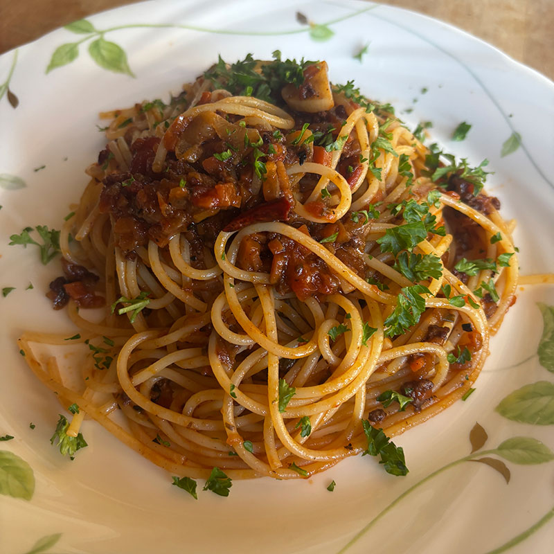 昨日のミートソースの残りが一食分には足りなかったので