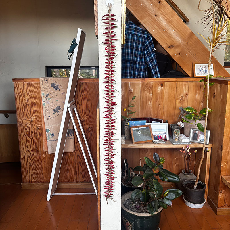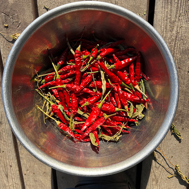 畑で育てた赤唐辛子。玄関の軒先で干した後室内でも干していた。