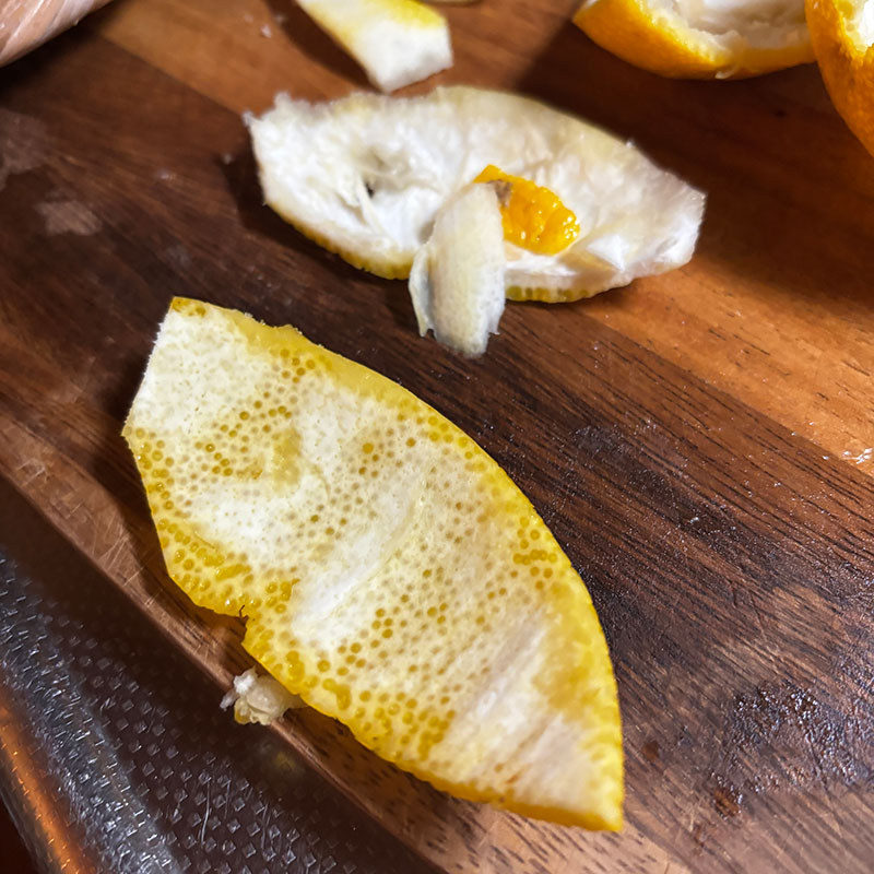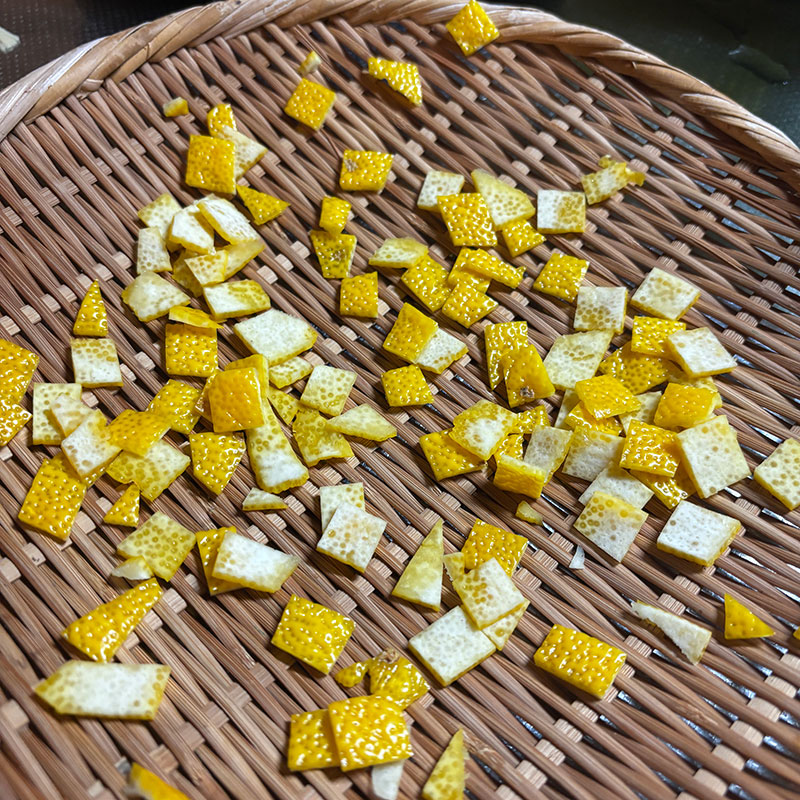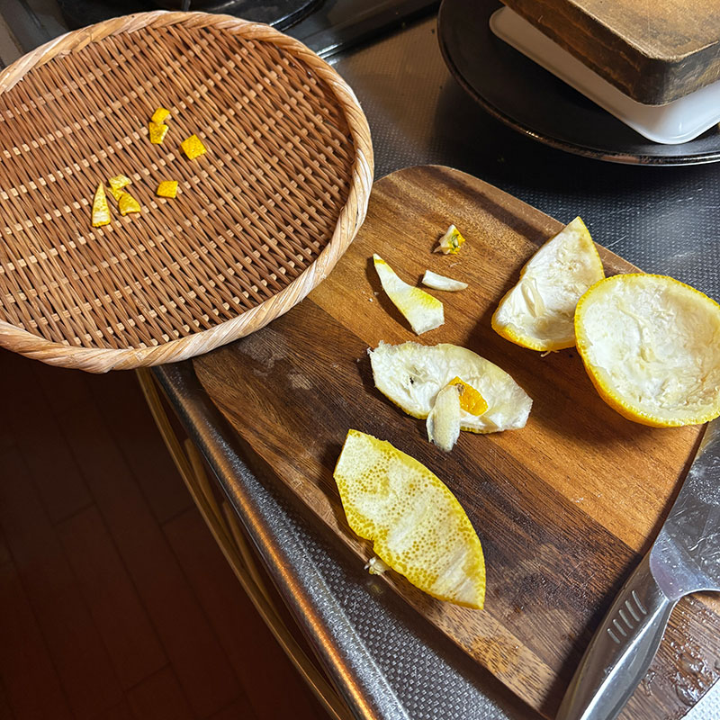 ひとつは皮を剥いて白いところを可能な限りそぎ取って黄色の皮だけにして小さく切った。