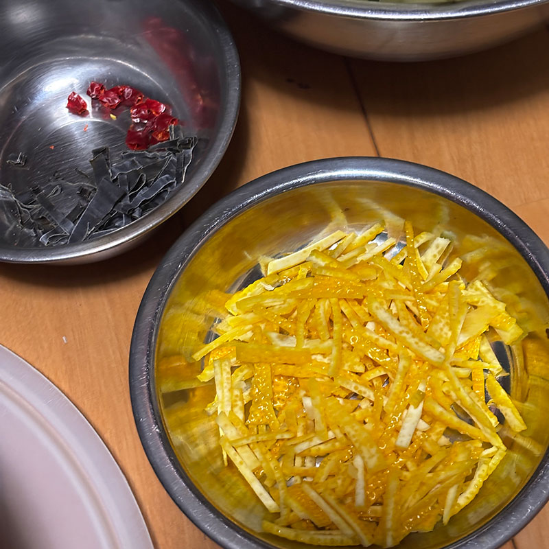 その時に買ってきた柚子の果汁と黄色の皮部分だけ千切りにしたものと赤唐辛子と日高昆布も。