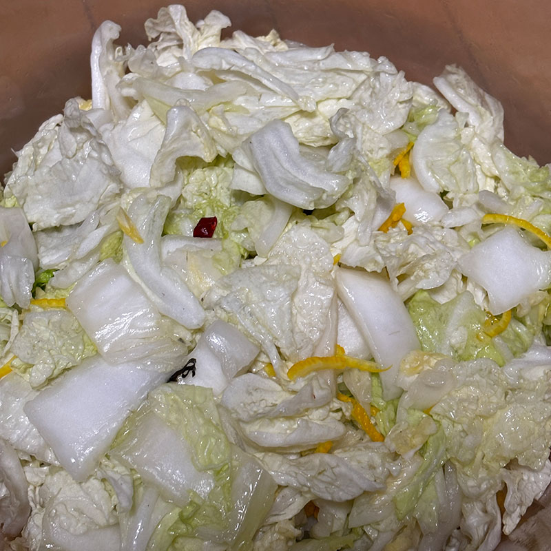 今回のように最初から葉を切って漬ける時は芯も捨てずに細い千切りにして入れると美味しいんだって。やってみる。