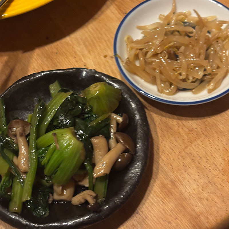 もやしのナムル。チヂミ菜の炒め。