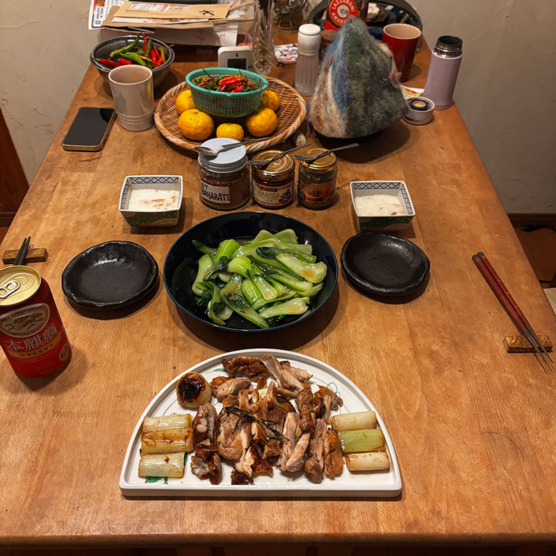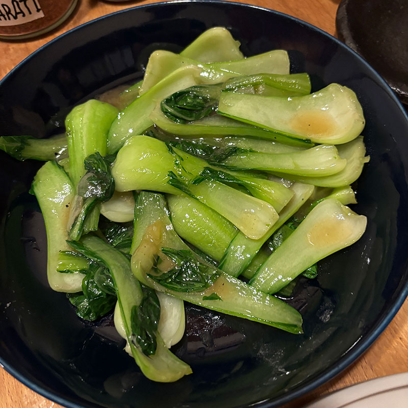 青梗菜の炒め。シャキシャキに炒めて。ツルツルで味が乗らないので片栗粉で餡がかりにするのが僕のやり方。青梗菜の茎の凹みをスプーンのようにソースをすくって食べると吉。シンプルだけど今宵も美味かったー。前仲万里子さんの半円の陶磁器のお皿デビュー!