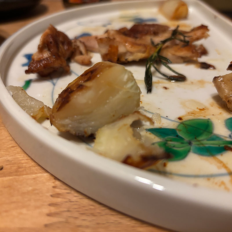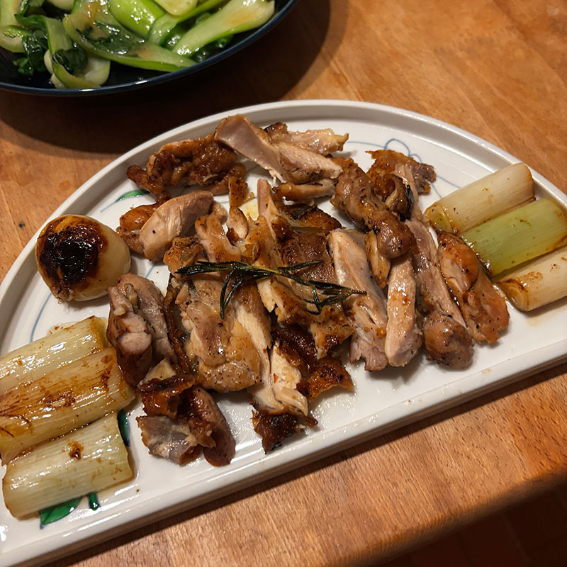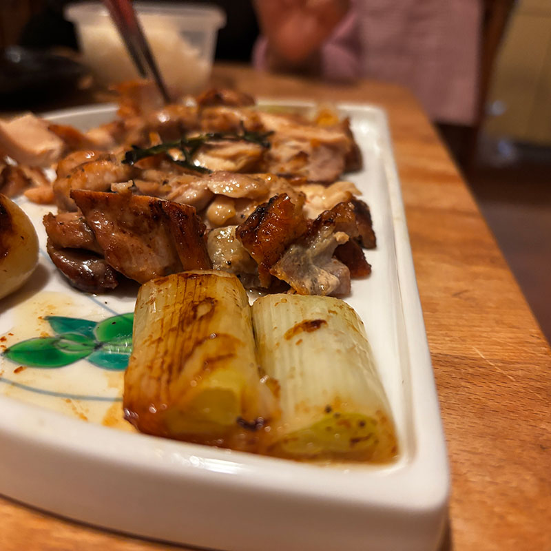 仕上げに太い長ネギを敷いて焼いたので鶏の旨みたっぷりの甘い長ネギも。甘い。