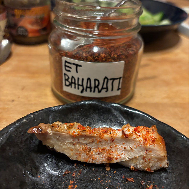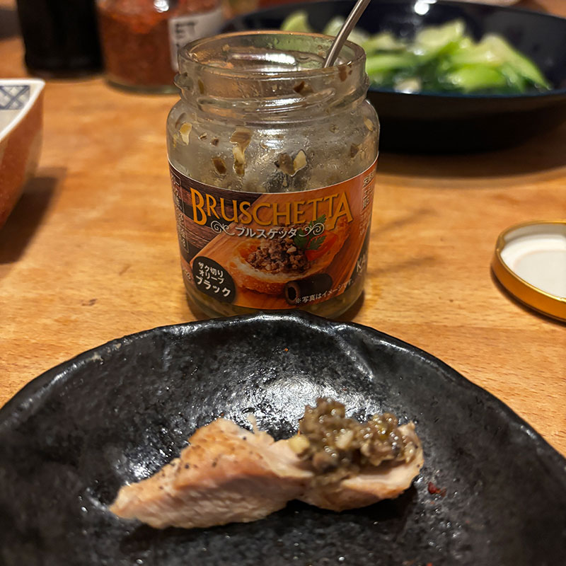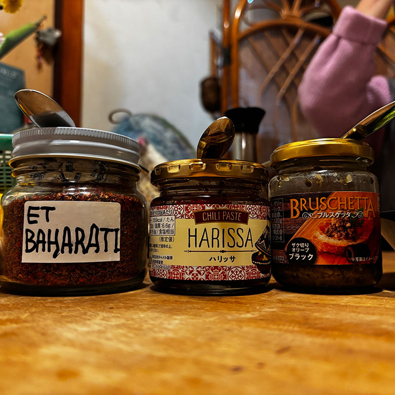 黒オリーブのソースも。これをブルスケッタって品名ににすると誤解が広がると思うんだけど。ブルスケッタってイタリアのトーストしたバゲットにニンニクを塗って何かを乗せた料理。多くの人はトマトを乗せたのを想像するはず。黒オリーブをブルスケッタって言ってしまうのは。。。味変はバハラットが一番美味しかった。この中東のスパイスブレンド最高だな。無くなったら自分で作ってみる。