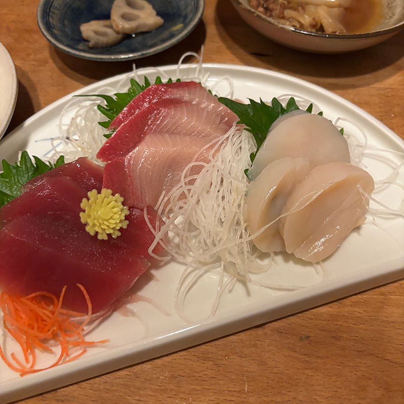 ミュゼマエナカの万里子さんの半円の磁器に刺身盛って。