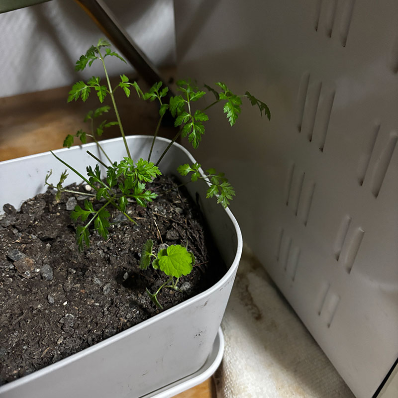 鉢で室内に取り込んだイタリアンパセリ散らして。