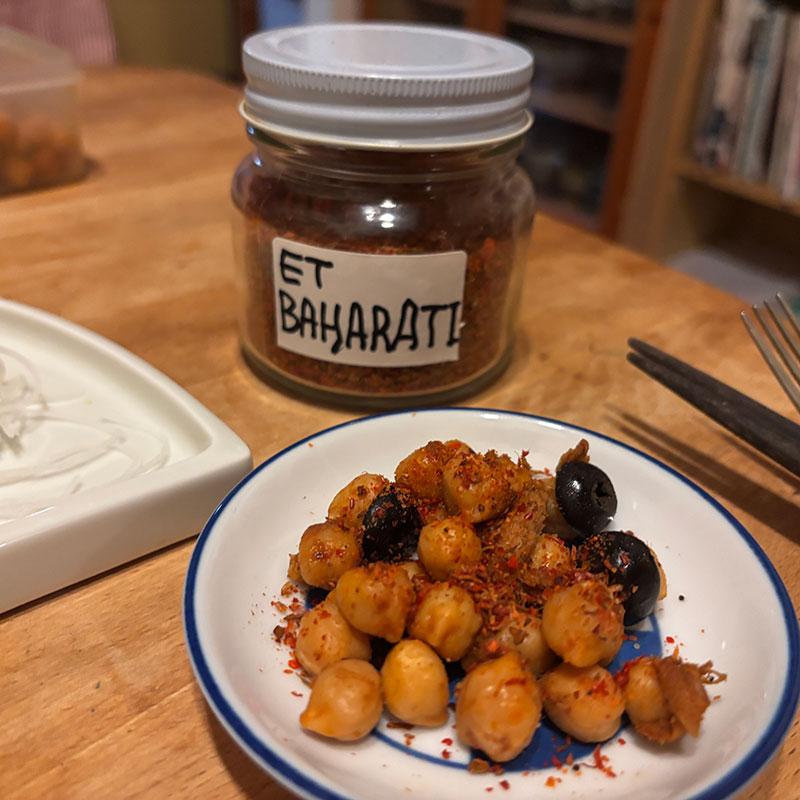 ひよこ豆と黒オリーブのスペイン風炒め物には姪っ子にもらったバハラットスパイス振りかけて。ポテトサラダとブロッコリーに自家製マヨネーズ。また和洋折衷。