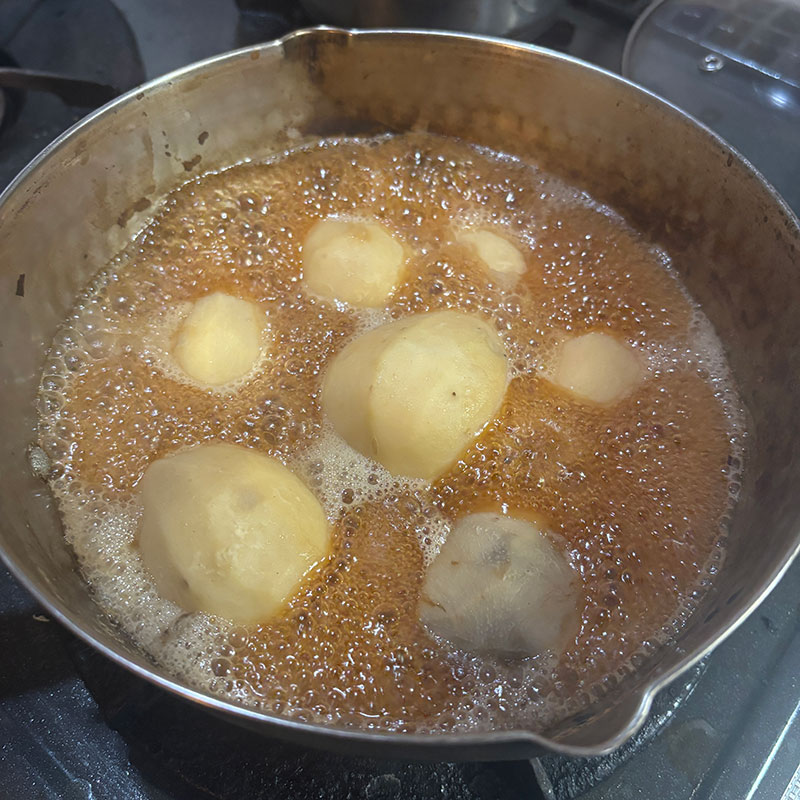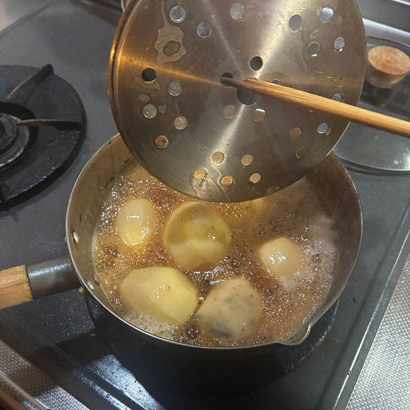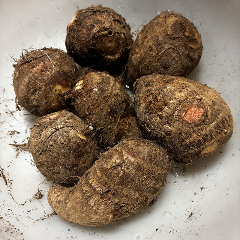里芋の皮剥きは上下を包丁で切ったら縦型ピーラーを手に包んで剥けば
