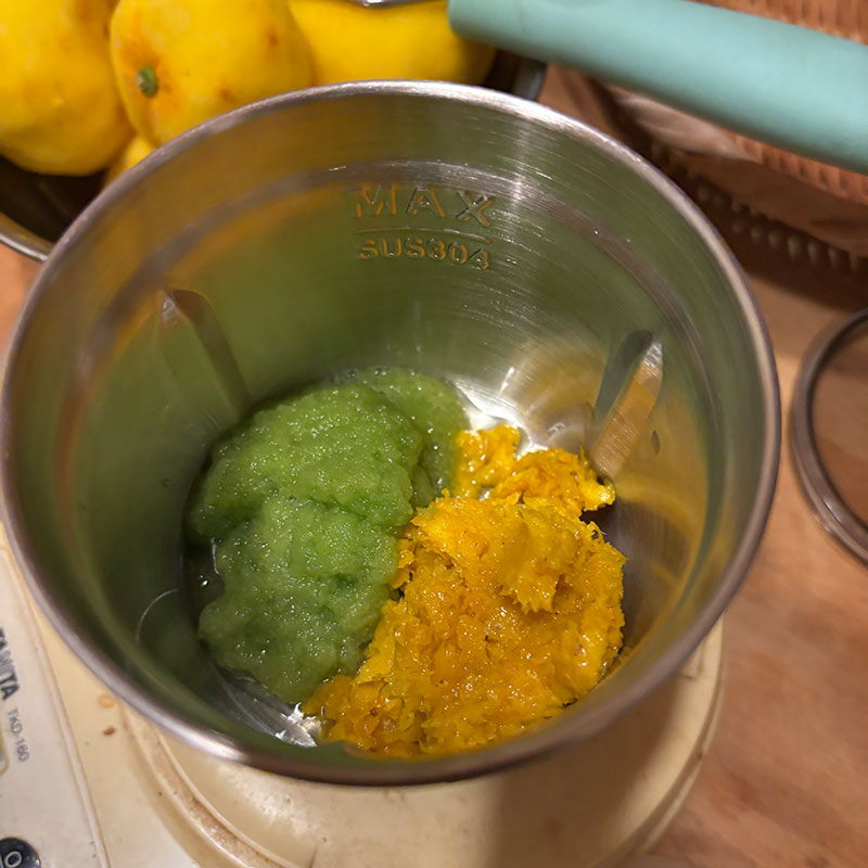 そのお陰で皮の黄色いところだけ擦った残りの実果汁絞ったらある程度取れた。