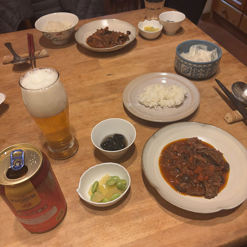 昨日からコトコト煮込んだ牛すじ肉の赤ワイン煮。柔らかく煮込まれた肉はほろほろで箸で持てないほど。