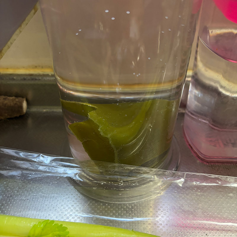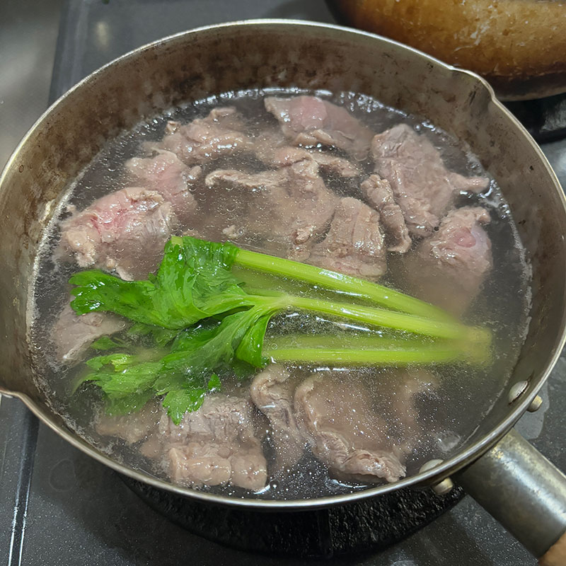 セロリの葉と一緒に下茹でした牛すじ肉を