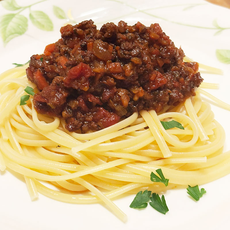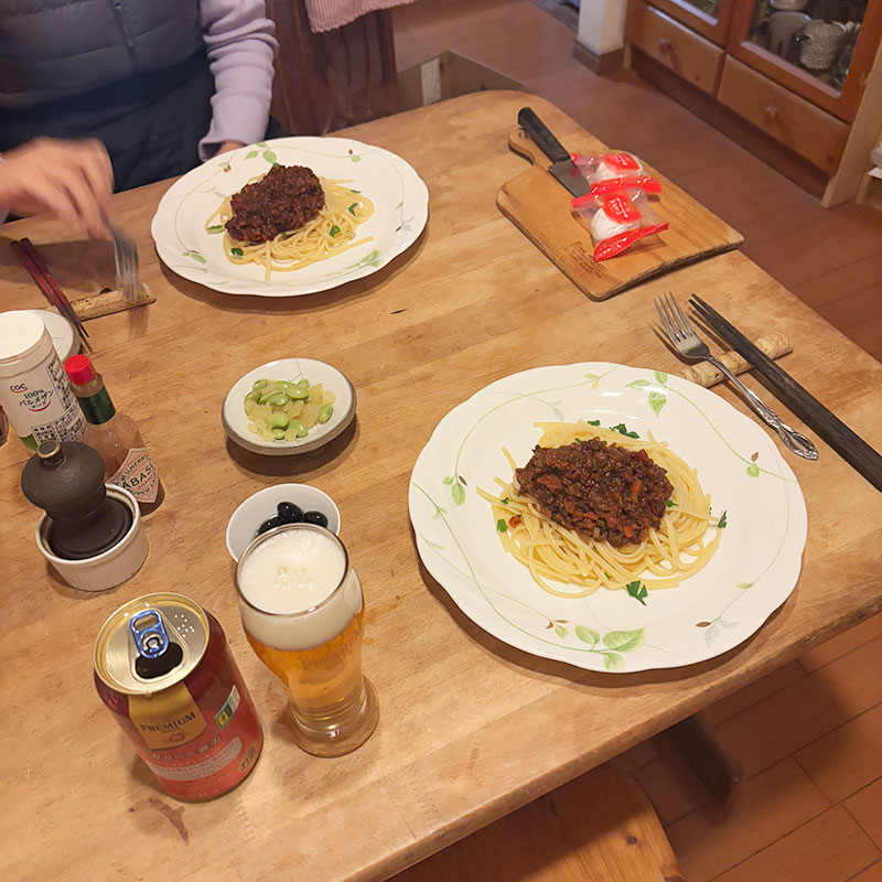 居酒屋我家、開店。昨年末に仕込んで冷凍して熟成させていたミートソースでパスタ。
