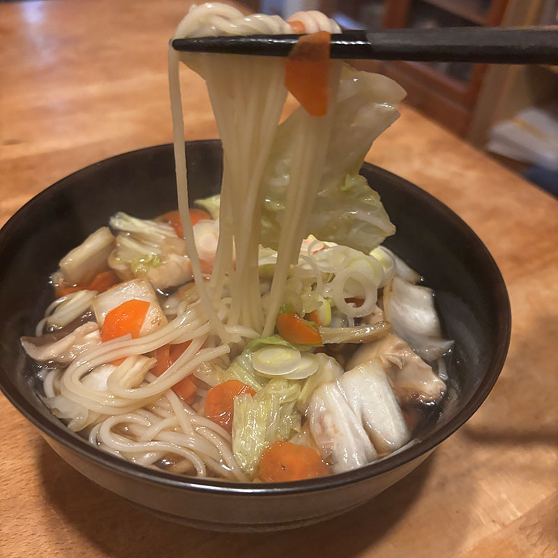 昆布水と昆布と出汁パックと醤油とみりんで美味しいつゆを作った。近所の方にいただいた白菜と三田農園のにんじん、冷凍して旨味を増した椎茸をさっと炒めて大好きなオカベの麺の上に乗せてつゆを注いだ。